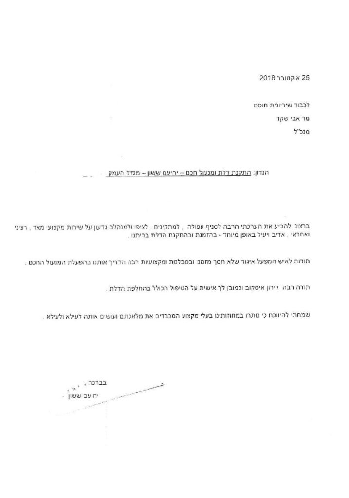 הנדון: התקנת דלת ומנעול חכם- יחיעם ששון- מגדל העמק חרמון 5